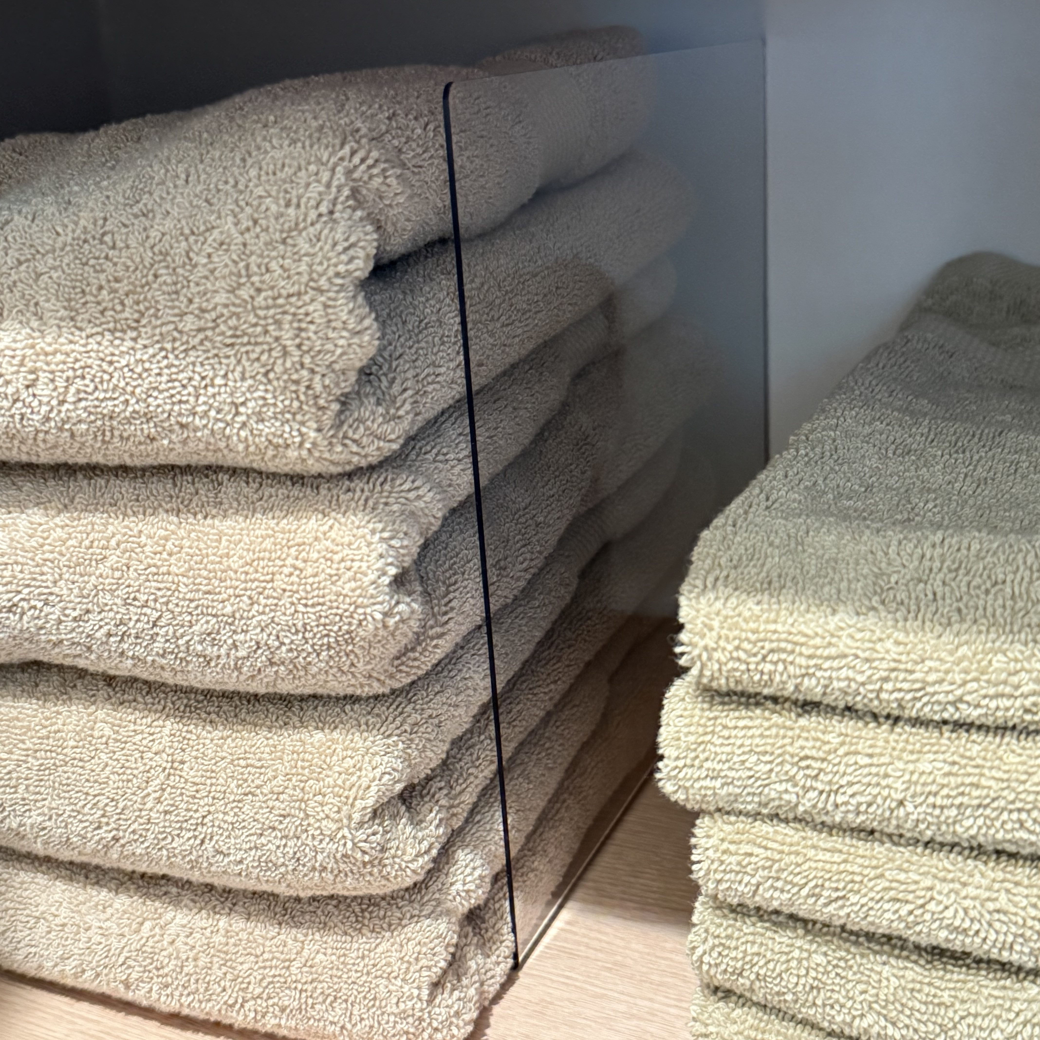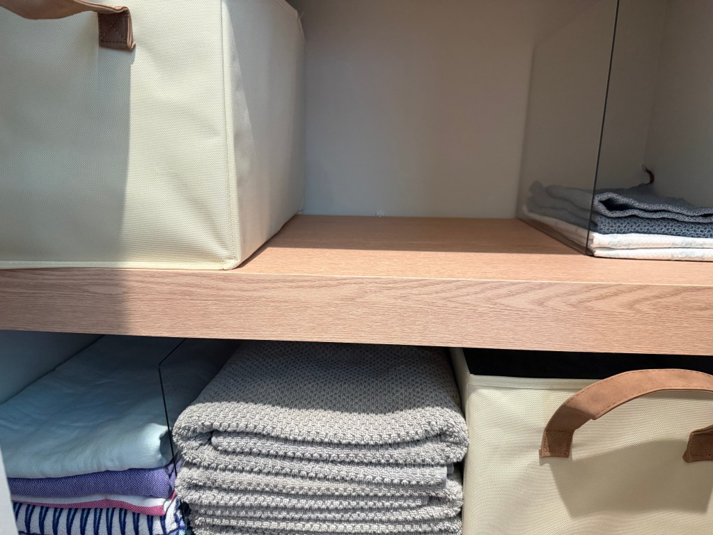 These clear shelf dividers help keep everything neatly separated by towel size so stacks stay organized and don’t topple over.