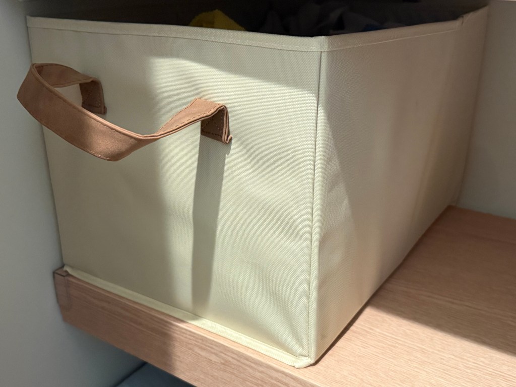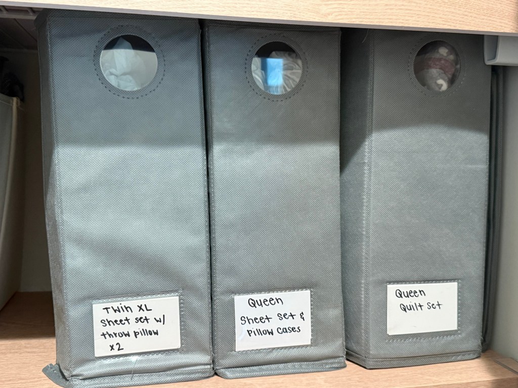 I’ve tried unstructured and vacuum seal bags before for storage, but they tend to look sloppy. I prefer a simple structured bin with pull handles that keeps everything looking clean and easy to access.