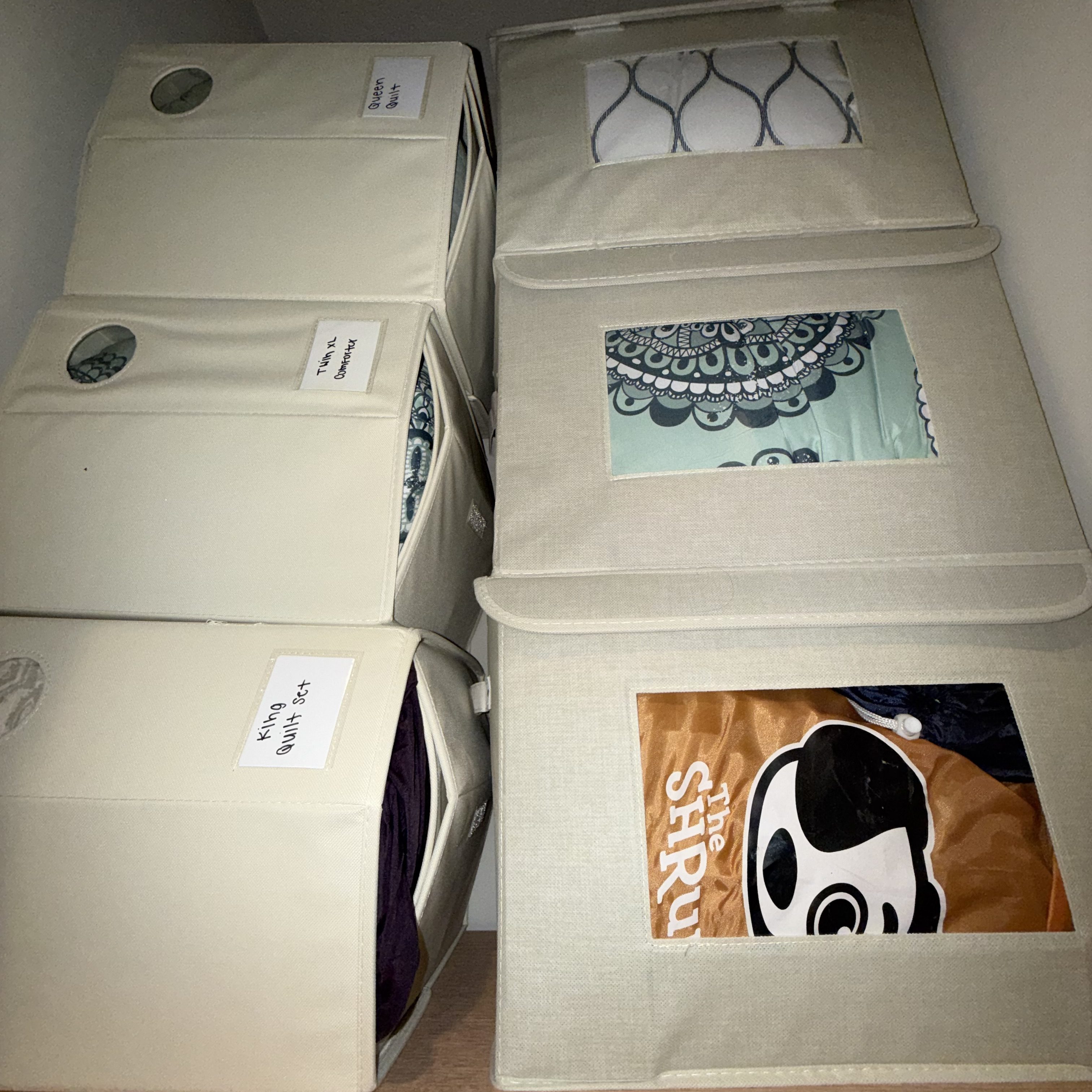 These storage boxes come with lids so they stack easily. I use them on the top shelf that extends up toward our 12-foot ceilings for seasonal linens and backup bedding that we don’t need to access often. The clear windows make it easy to quickly see what’s inside without pulling every box down.